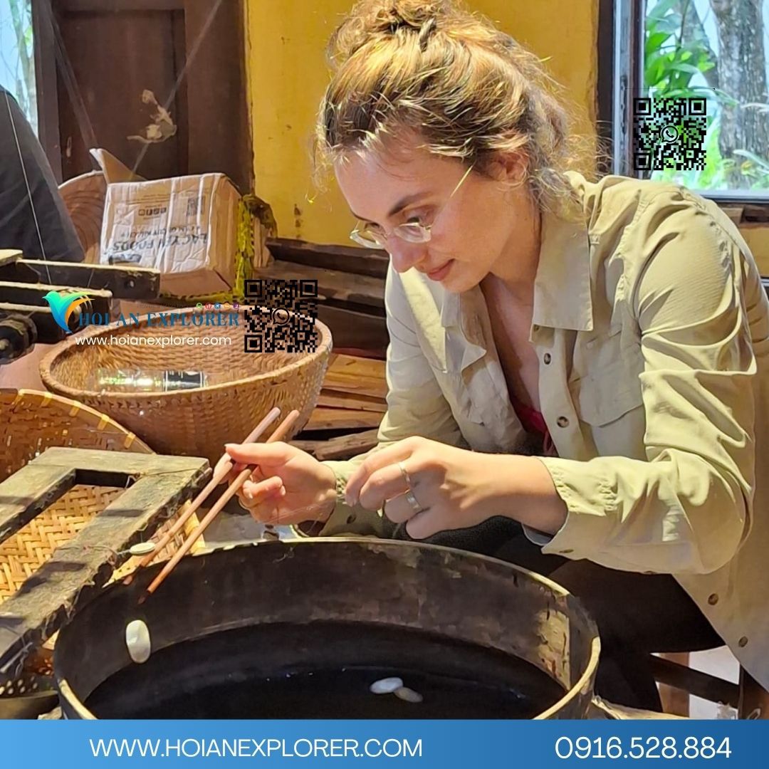 More interesting, the Hoi An Handicraft tour will take you to visit the silk workshop and the weaving process of the Cham people. Furthermore, you will experience collecting mulberry leaves to feed the silkworms, cooking the cocoons, and weaving silk yourself. It’s a fantastic activity on the tour that clearly shows how the Champa people work with silk.