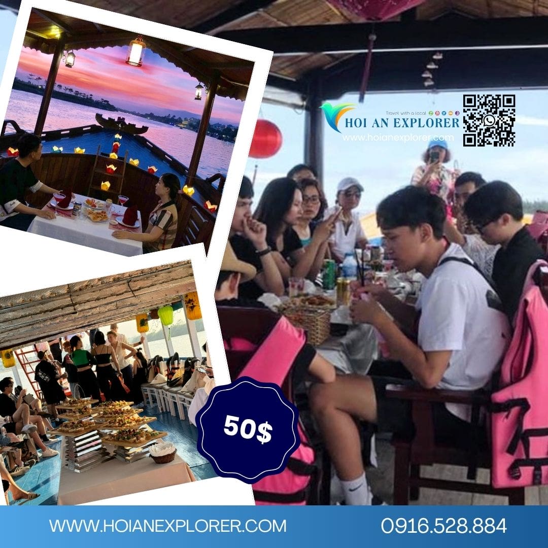 Traditional Hoi An wooden boat lunch tour: Enjoy a delicious, freshly prepared lunch aboard a traditional Hoi An wooden boat cruise as you gently float along the picturesque Hoai River. This scenic experience provides stunning views of Hoi An’s ancient town from a unique vantage point, making it a perfect Hoai River lunch cruise.